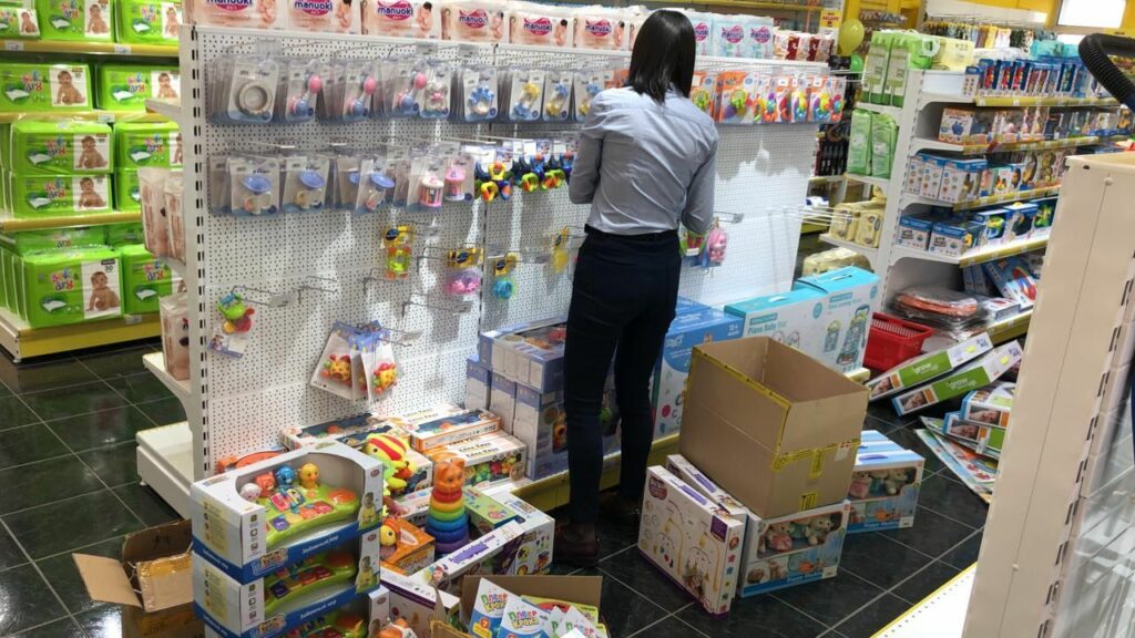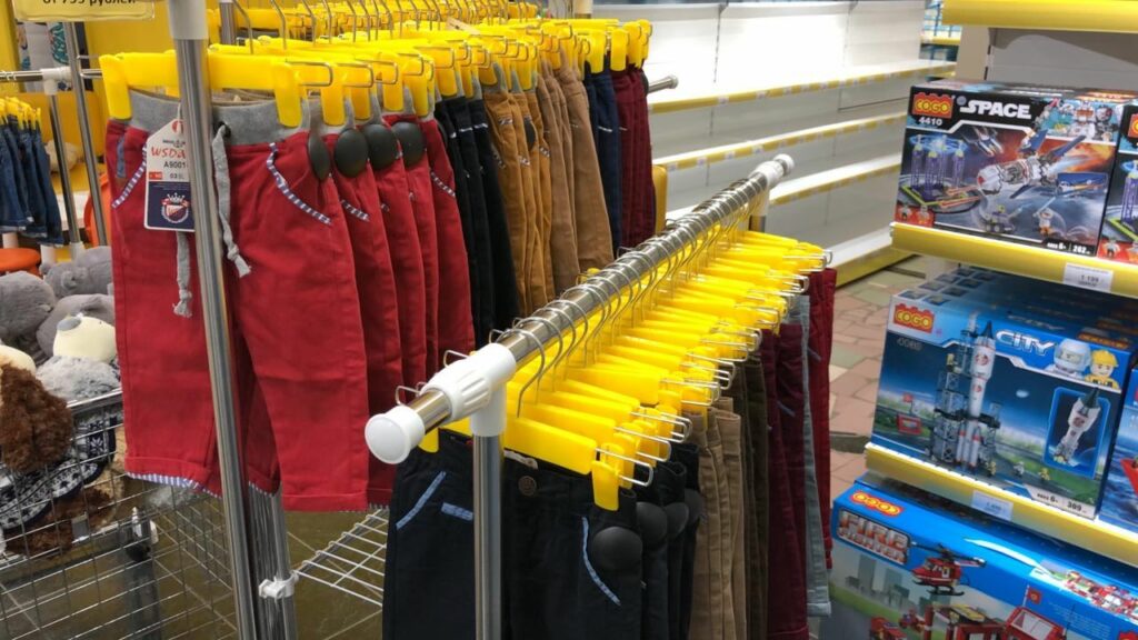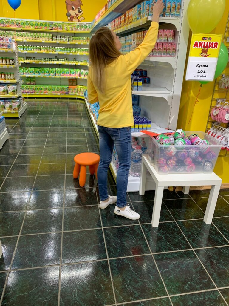 Все это нужно было разложить красиво на полках, чтобы выкладка соблазняла мамочек покупать помимо питания еще и одежду.