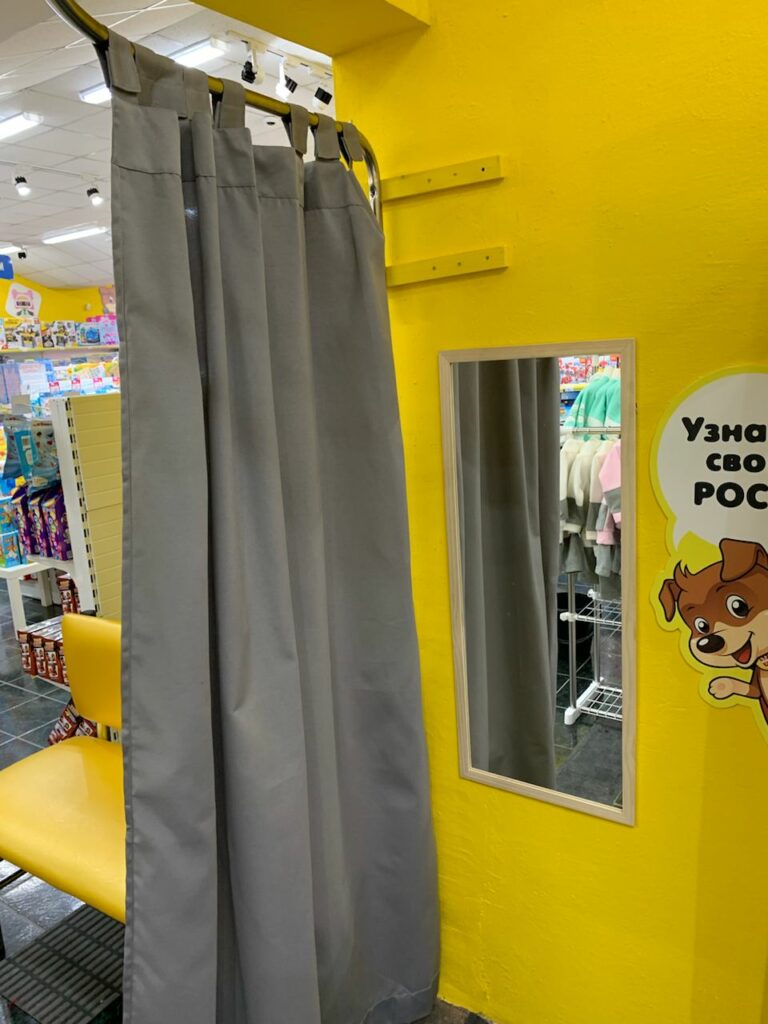 Когда шторы примерочной были прикрыты, то как бы из-за угла там махал лапой щенок, зазывая нас примерить одежду.