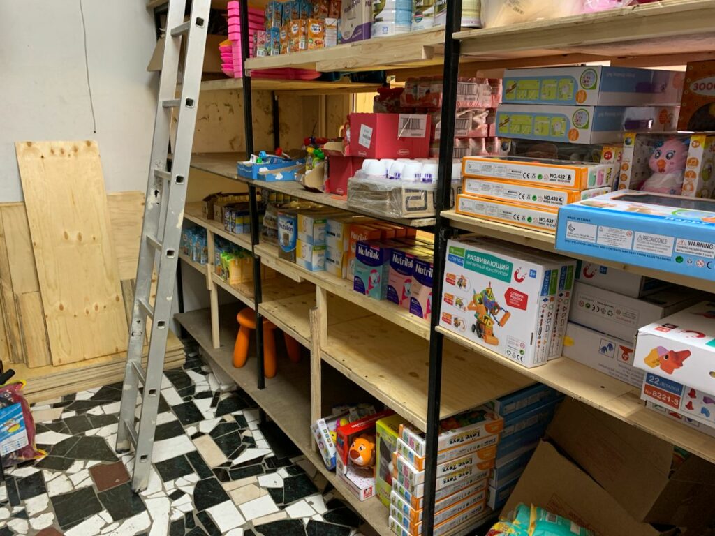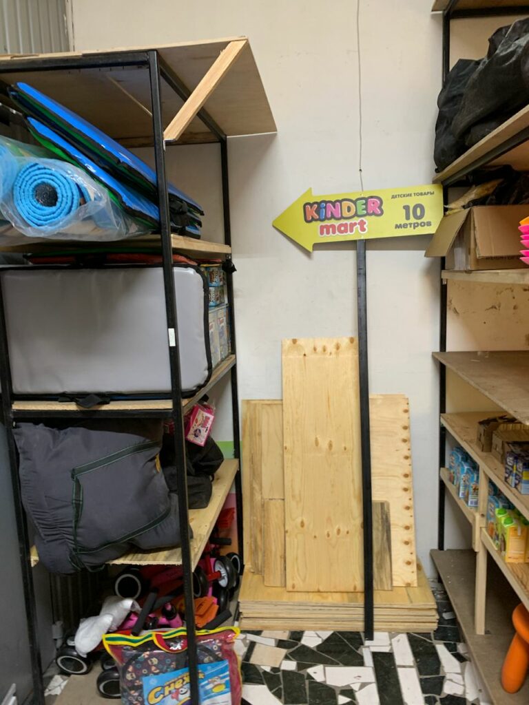 Деревянные полки на складе в магазине Киндер Март.